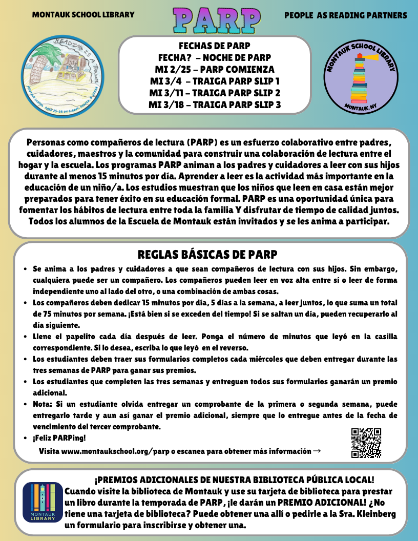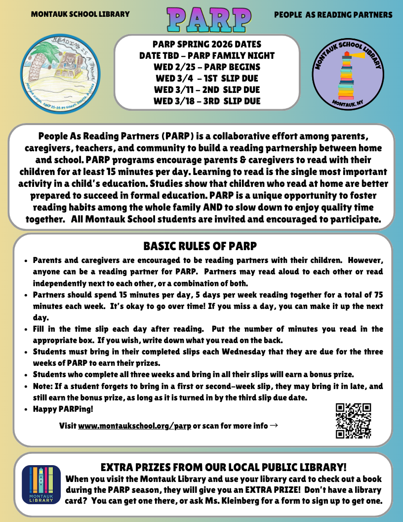 📚People As Reading Partners (PARP) wraps up this week!  We hope you have enjoyed this opportunity to build healthy family reading habits and spend quality time together.  Your PARP Packet was sent home with your child the first week of PARP.  The packet includes details about the program, important dates, and the PARP weekly slips. Click here for a printable packet.